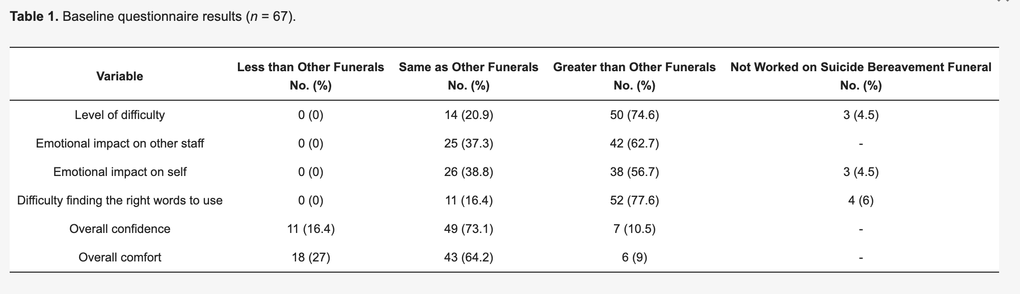 The baseline questionnaire asked about experiences including the comparative difficulty and emotional impact of working with suicide bereavement funerals. The post questionnaire asked about the impact of the Training including confidence, awareness and willingness to share postvention information. Questionnaires were distributed and reported in Qualtrics software and data were recorded in Likert scales. To protect participant anonymity given the small sample size and context, baseline and post-Training surveys were not matched.